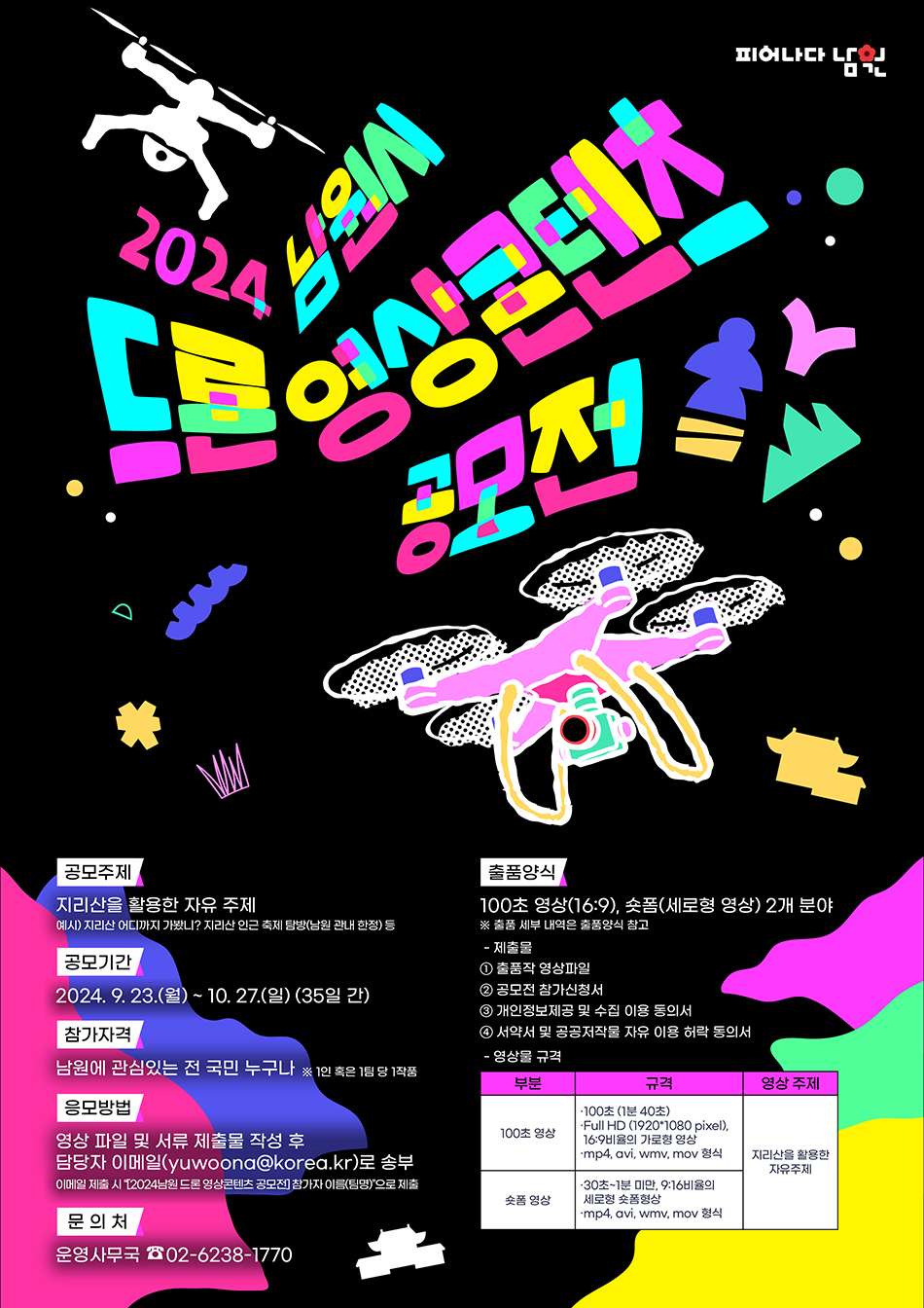「2024년 남원시 드론 영상콘텐츠 공모전」을 개최하오니, 많은 관심과 적극적인 참여 부탁드립니다.