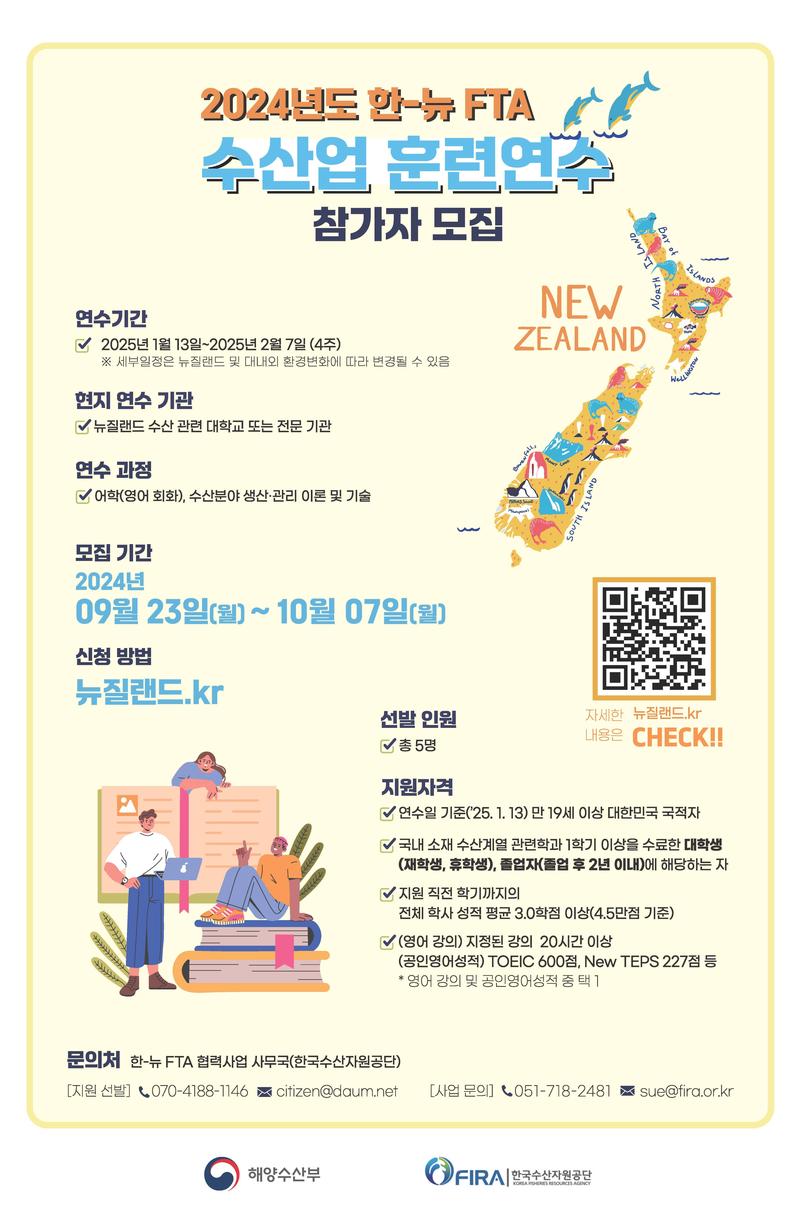 한국수산자원공단은 한국과 뉴질랜드 간의 FTA 체결에 따른 수산협력의 일환으로, 청년들의 글로벌 마인드 함양 및 수산업 분야 직무능력 향상을 위한 한-뉴 수산업 훈련연수 참여자를 모집하오니, 수산분야 미래세대의 많은 참여를 바랍니다.
