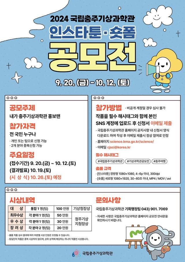 - 국립충주기상과학관에서 기상 · 기후과학문화의 대중화 및 운영 활성화를 위해 친근하고 흥미롭게 다가갈 수 있는 인스타툰 · 숏폼 공모전
