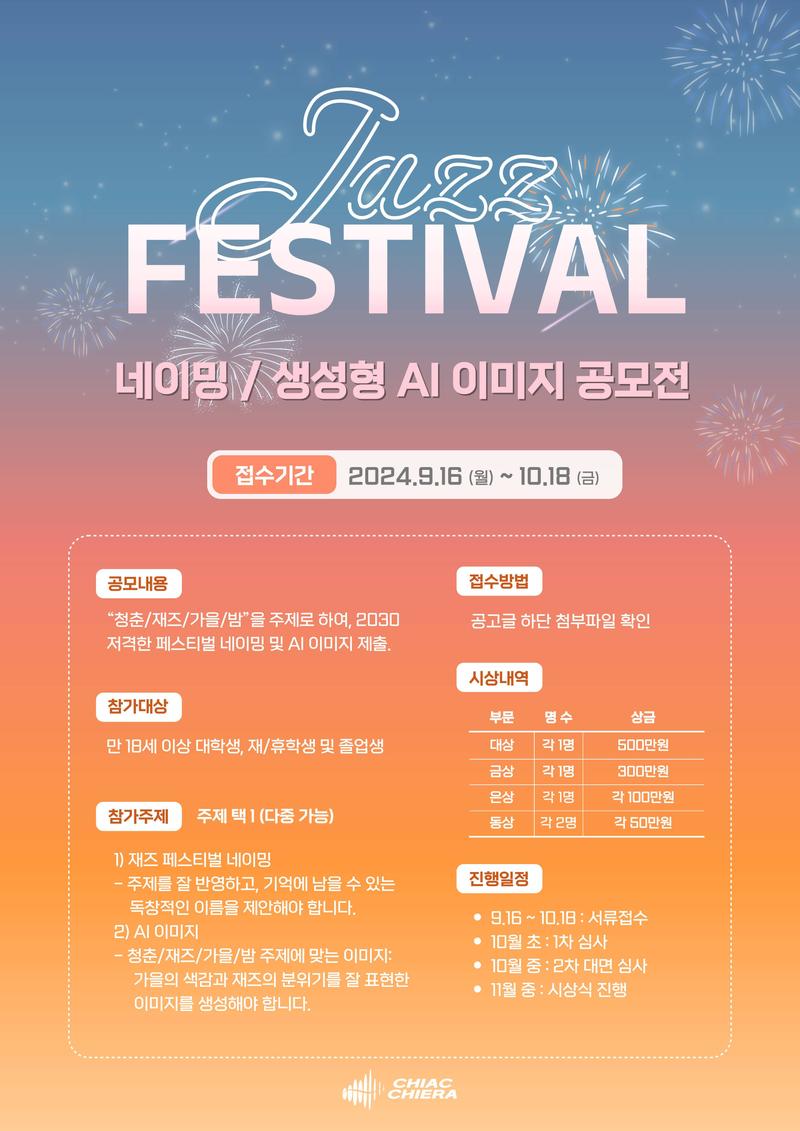 이 공모전은 청춘과 재즈, 가을의 조화를 통해 2030 세대의 감성을 자극하는 페스티벌을 기획하는 데 중점을 두고 있습니다. 창의적이고 매력적인 네이밍과 이미지를 통해 많은 참여 바랍니다.