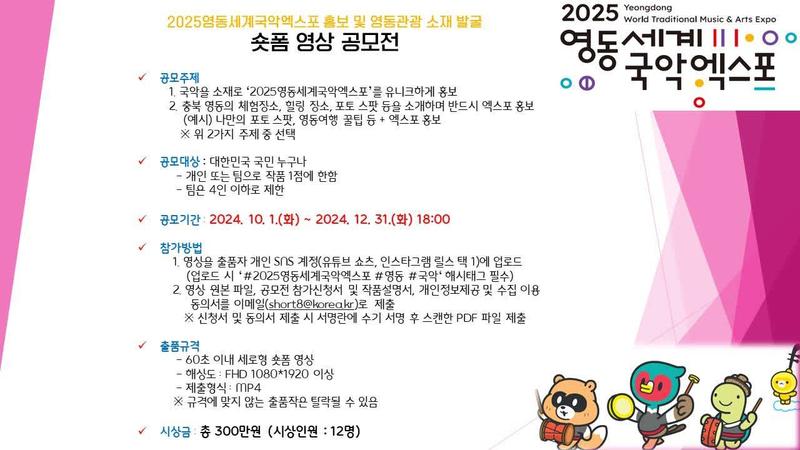 2025영동세계국악엑스포를 홍보하고 영동군의 매력적인 모습을 소개하는 숏폼 영상 발굴을 위해 공모전을 개최하오니 적극 응모하여 주시기 바랍니다.
