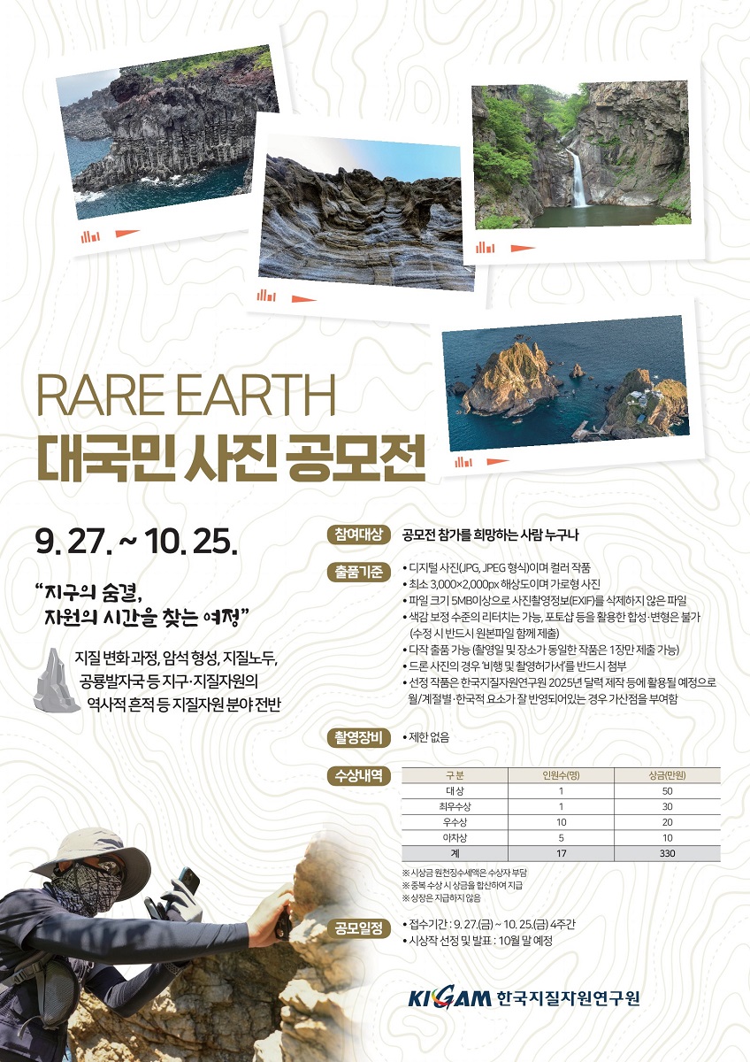 - 선정 작품은 한국지질자원연구원 2025년 달력 제작 등에 활용될 예정으로 계절·한국적 요소가 잘 반영되어 있는 경우 가산점을 부여함