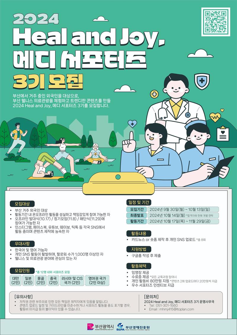 부산에서 거주 중인 외국인을 대상으로, 부산 웰니스 의료관광을 체험하고 트렌디한 콘텐츠를 만들 ⭐2024 Heal and Joy, 메디 서포터즈 3기⭐를 모집합니다. 각국 SNS에서 유행하는 숏폼이나 밈을 활용하여 유쾌한 부산 이미지를 함께 만들어 갈 분들의 많은 관심과 참여 부탁드립니다!