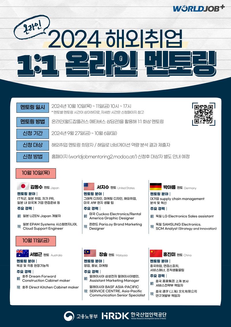 한국산업인력공단에서 2024 해외취업 온라인 1:1 멘토링을 진행합니다.