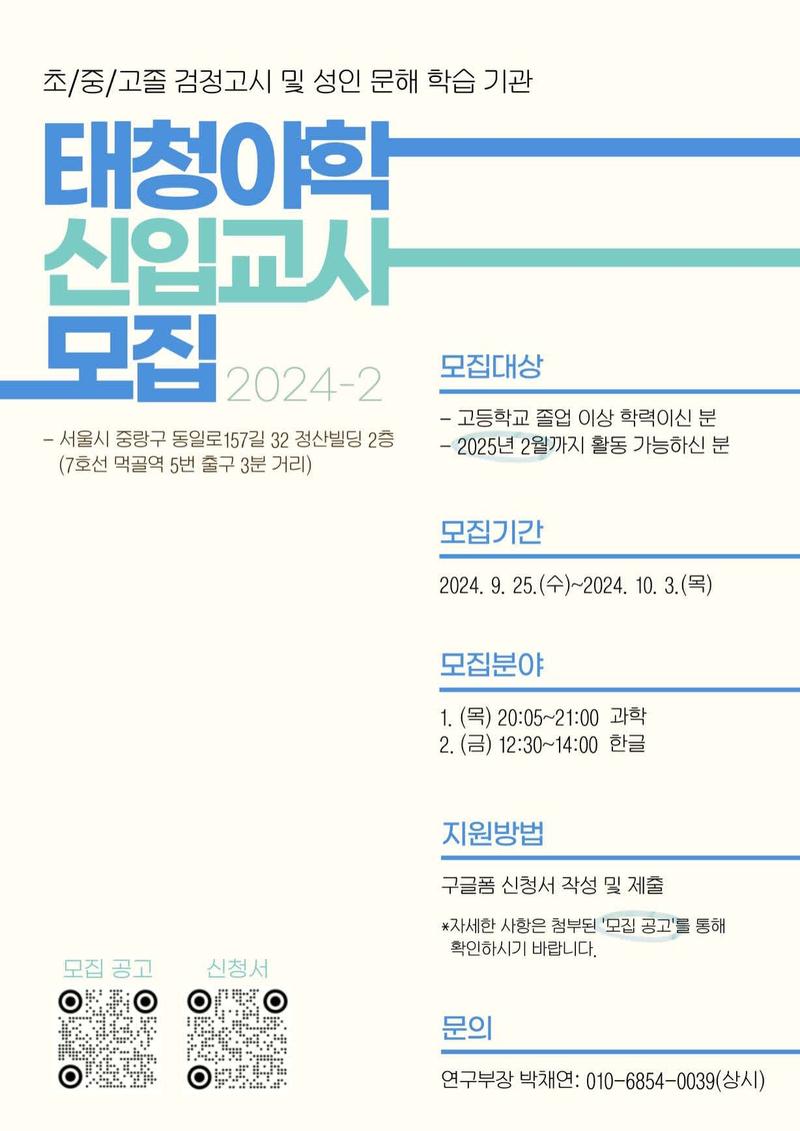 태청야학에서 2024학년도 2학기 2차 신입 교사를 모집합니다!