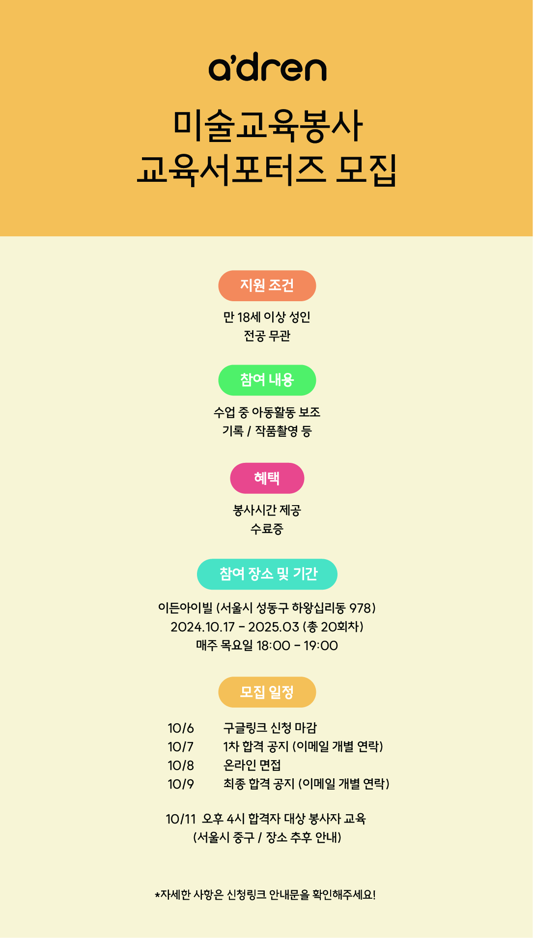 2024 진행하는 에이드런의 자체교육봉사 서포터즈를 모집합니다.