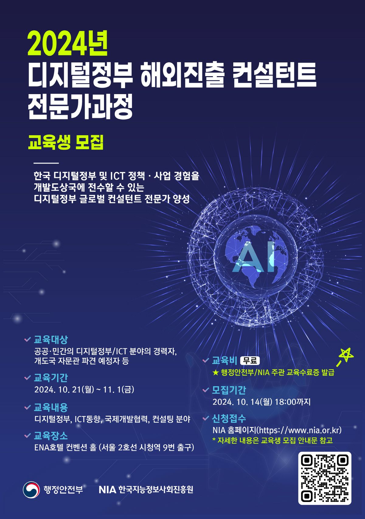 이에 2024년 디지털정부 해외진출 전문가 과정 교육생을 아래와 같이 모집하오니