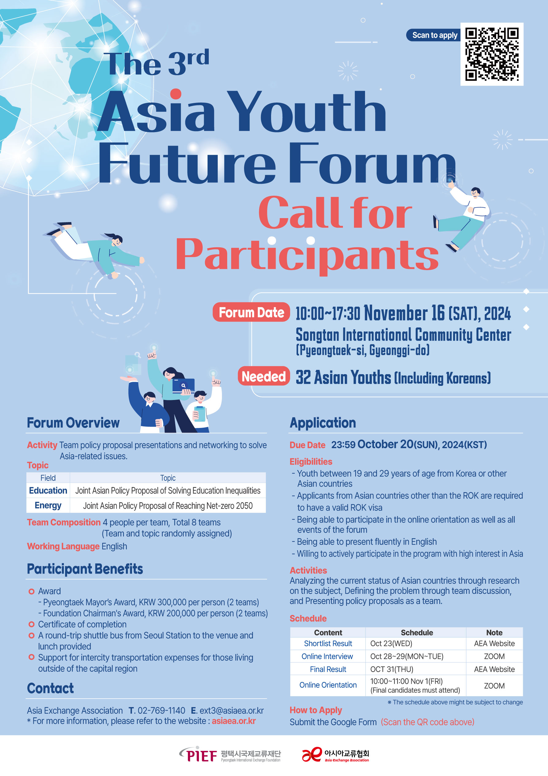 The Pyeongtaek International Exchange Foundation and Asia Exchange Association are hosting ‘The 3rd Asia Youth Future Forum,’ a forum through which Korean and Asian youths can grow to become global leaders by seeking and presenting policy proposals on international issues. Youth wishing to lead the bright future of Asia are encouraged to apply. Please refer to the descriptions below for more information.