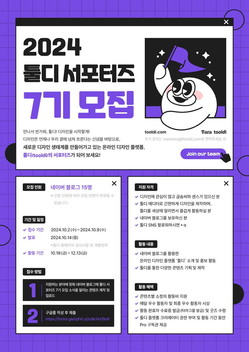 새로운 디자인 생태계를 꾸려 나가는 툴디(tooldi)의 일곱 번째 서포터즈를 모집합니다!