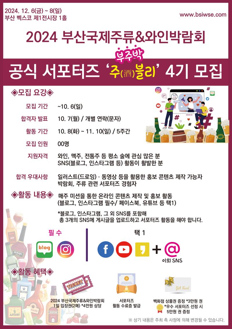 ▶ 활동 혜택: 1) 2024 부산국제주류&와인박람회 1일 입장권 2매 *4만원 상당