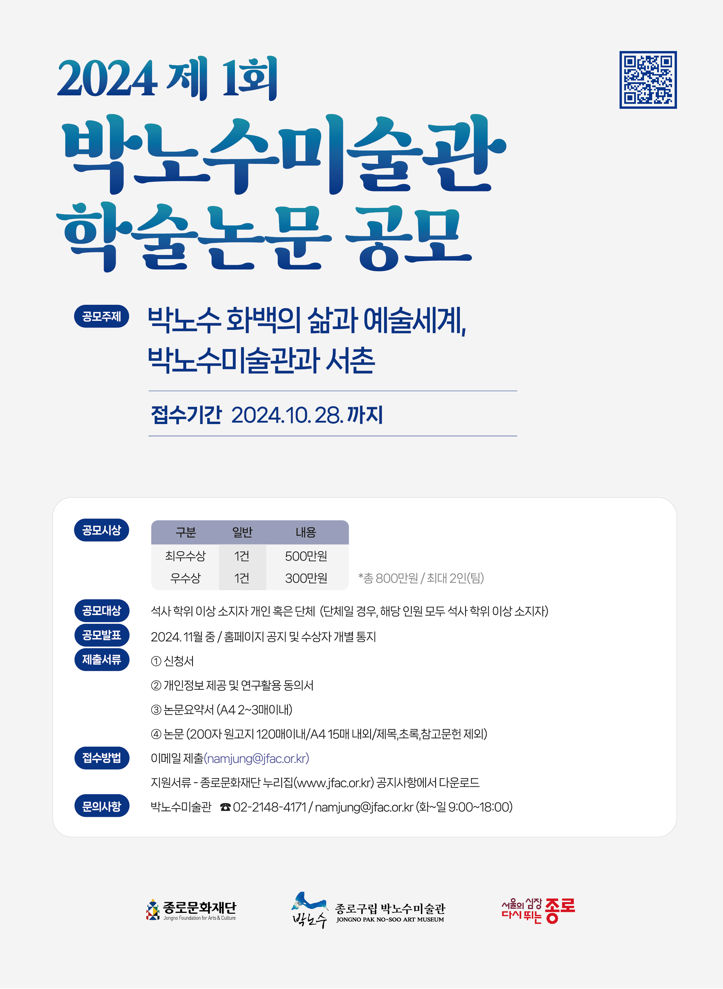○ 결과발표 : 2024년 11월 1주 ~ 2주 예정(종로문화재단 홈페이지 공지 및 개인 통보)