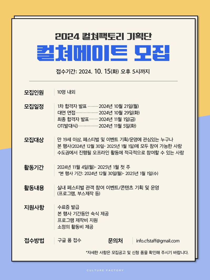 컬쳐팩토리 기획단 '2024 컬쳐메이트'를 모집합니다!