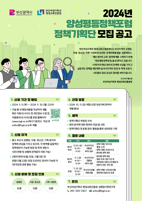 부산여성가족과 평생교육진흥원에서는 부산지역의 성평등, 아동‧청소년, 가족‧다문화와 관련한 정책의제를 발굴・공론화하고, 해당 분야의 교류・협력체계를 구축하기 위해 「양성평등정책포럼」을 운영하고 있습니다. 이에 따라 해당 분야의 정책에 관심을 가지고 실질적인 정책을 제안해주실 부산지역의 현장 및 학계 전문가, 시민들의 많은 관심과 참여를 부탁드립니다.