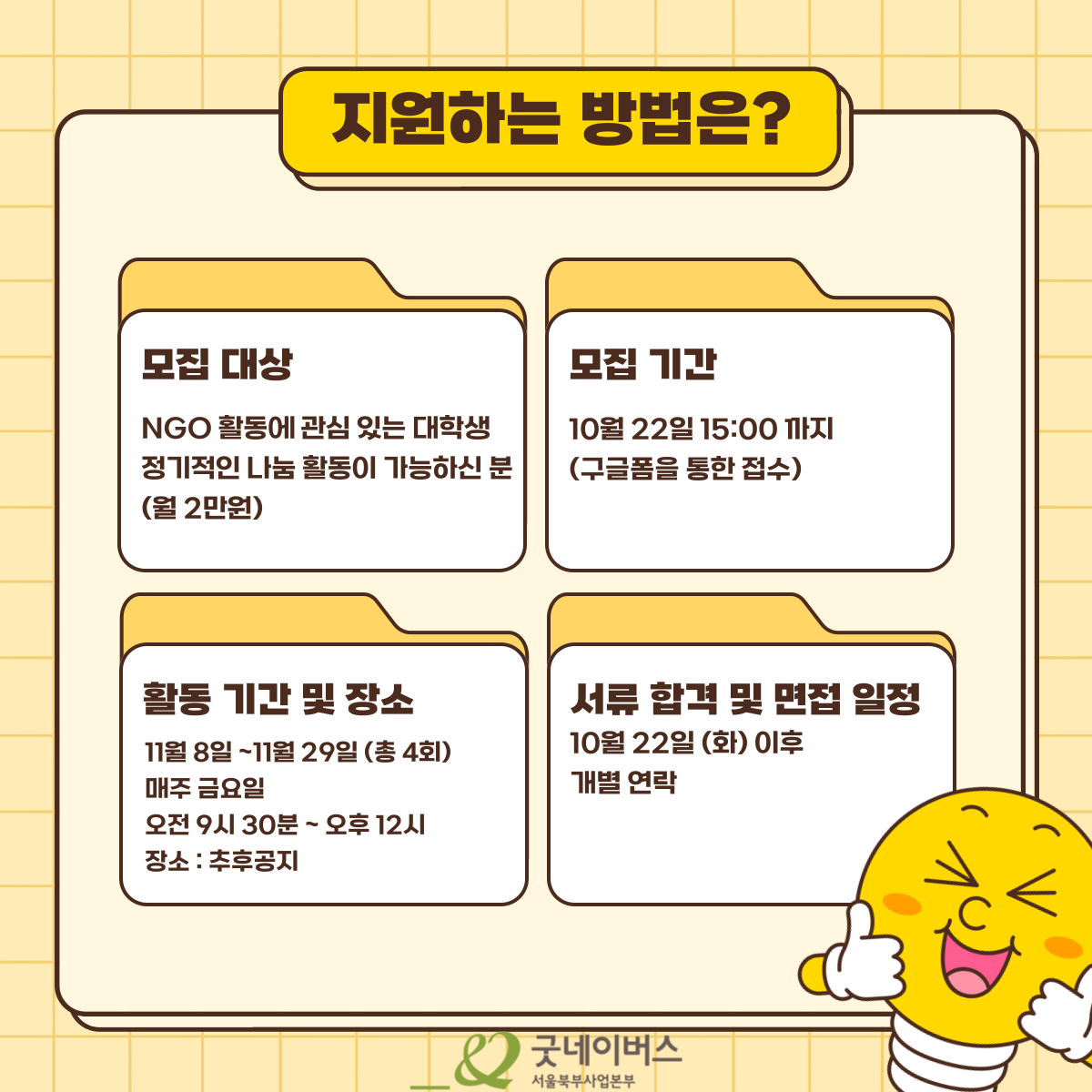모집 대상: NGO 활동에 관심이 있는 대학생, 정기적인 나눔 활동이 가능한 분 (월 2만 원)