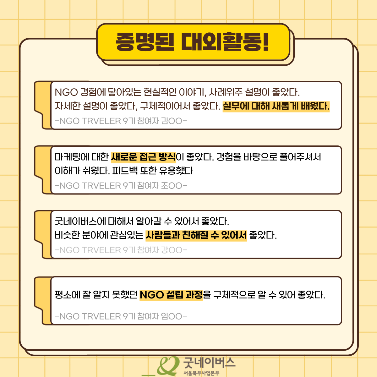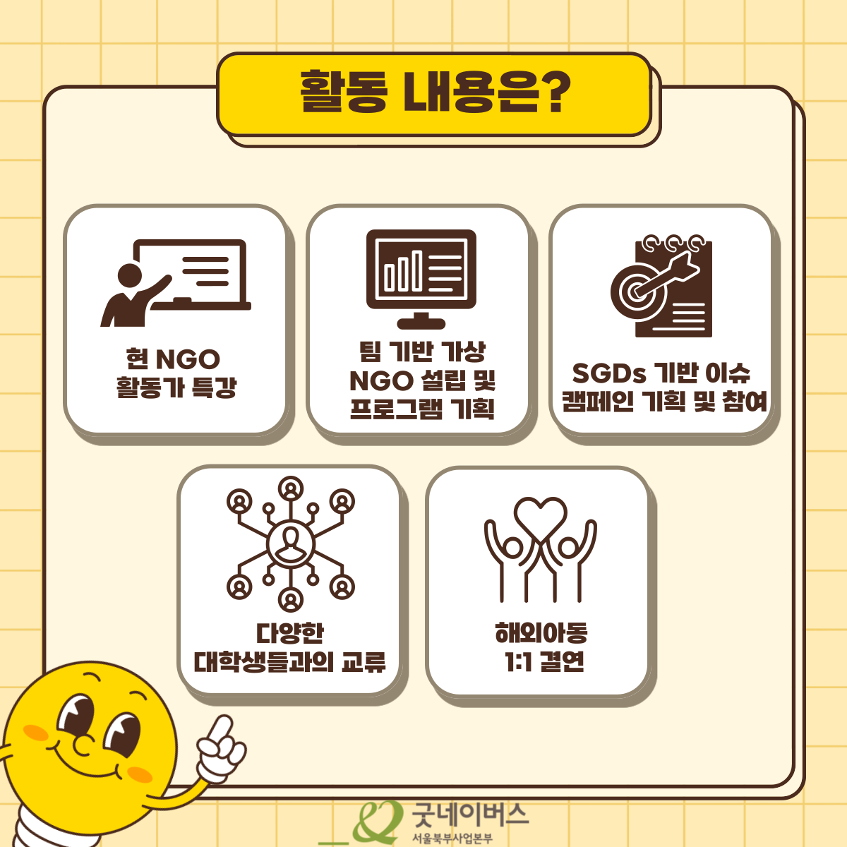 굿네이버스가 주최하는 NGO Traveler 10기에서 4주간의 특별한 대외활동을 통해 여러분은 글로벌 사회 문제 해결 전략을 배우고, 기업과 협력한 캠페인을 직접 기획하는 기회를 갖게 됩니다.