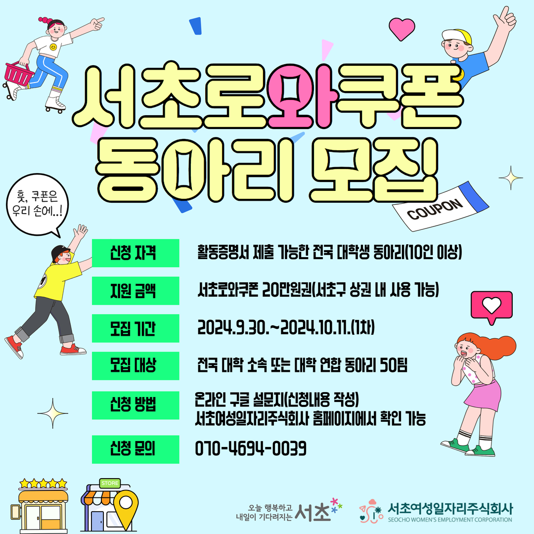 - 지원 내용 : 서초구 상권 내 사용 가능한 할인쿠폰 20만 원