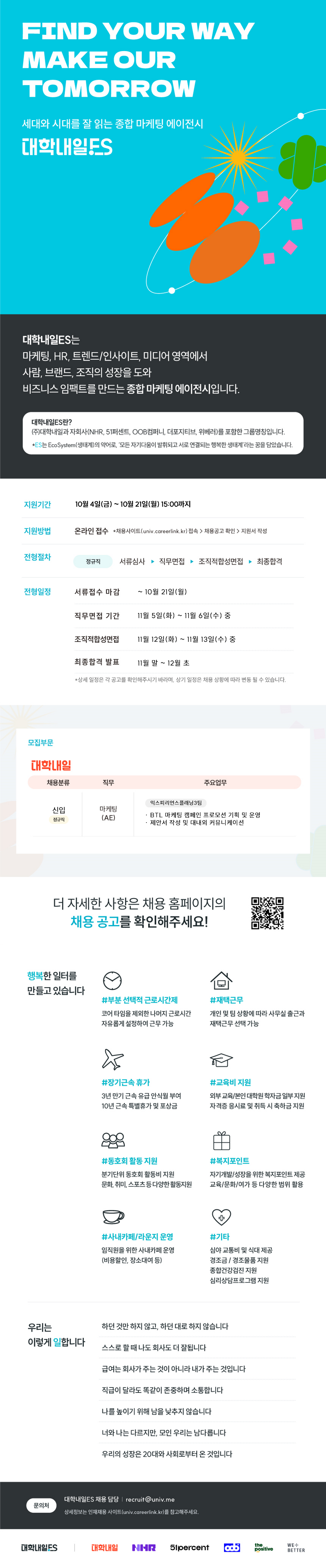 서류전형 : ~10/21 15:00 (*합불 여부와 관계 없이 지원해주신 모든 분들께 메일 및 마이페이지를 통해 결과를 안내 드립니다.)