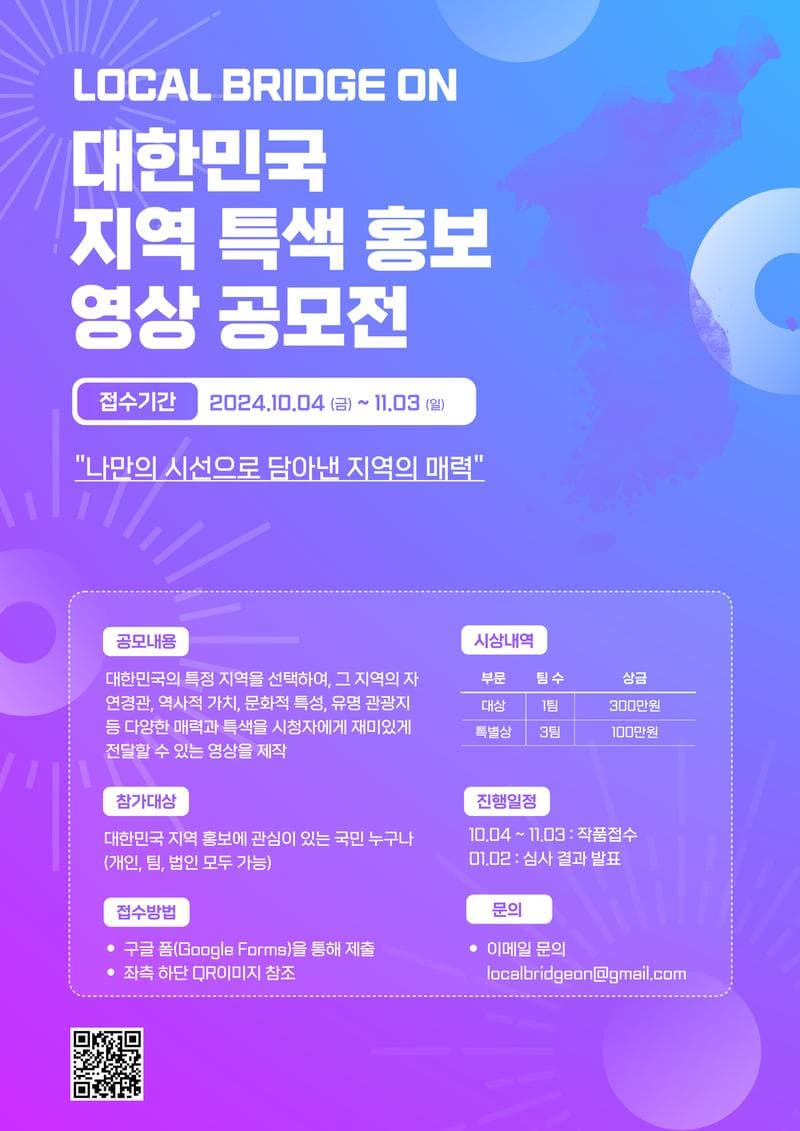 - 특별상: 홍보한 지역(지자체)에 대한 영상 제작 용역 제공 기회(회당 100만원)