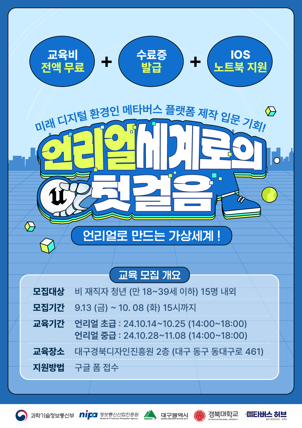 - 10월 14일 (월) : 언리얼 엔진, 설치, 화면구성, 에디터, 뷰포트 - 10월 15일 (화) : 액터, 조작, 지오메트리, 재질, 조명 - 10월 16일 (수) : 프로젝트 준비, 비주얼 스크립팅, 노드 구조 제어 - 10월 17일 (목) : 클래스, 라이프 사이클, 프로토 타입 - 10월 18일 (금) : 플레이어 컨트롤, 충돌 처리, 배경 스크롤 - 10월 21일 (월) UI 제작, 패키징 - 10월 22일 (화) : 언리얼 C++ - 10월 23일 (수) : 언리얼 C++ 개체 조작 - 10월 24일 (목) : 언리얼 C++ 기능, 위젯 - 10월 25일 (금) : 언리얼 C++ 액션