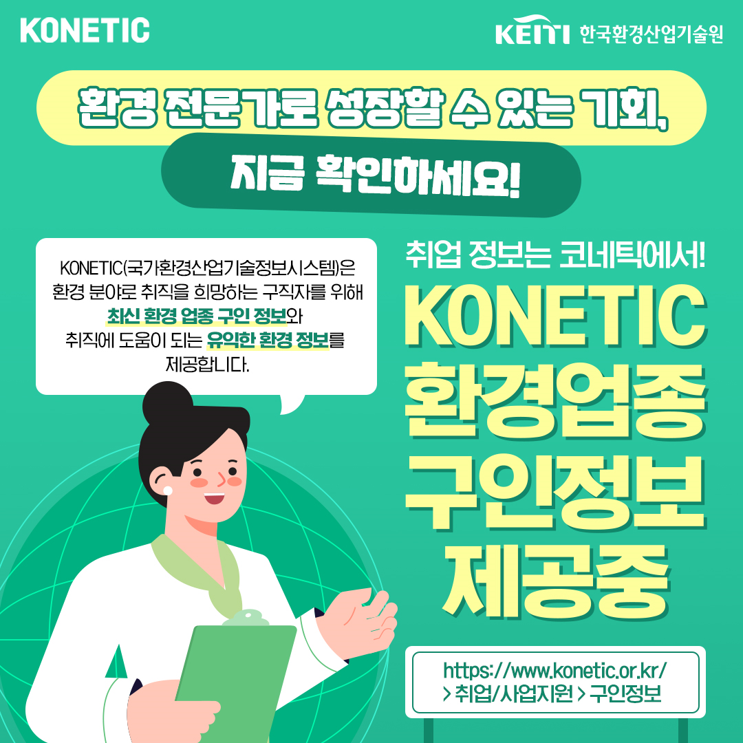 한국환경산업기술원이 운영하는 "국가환경산업기술정보시스템(KONETIC)"은 환경 분야의 종합 정보 포털로, 여러분이 취업 준비에 필요한 모든 정보를 쉽게 찾을 수 있습니다.