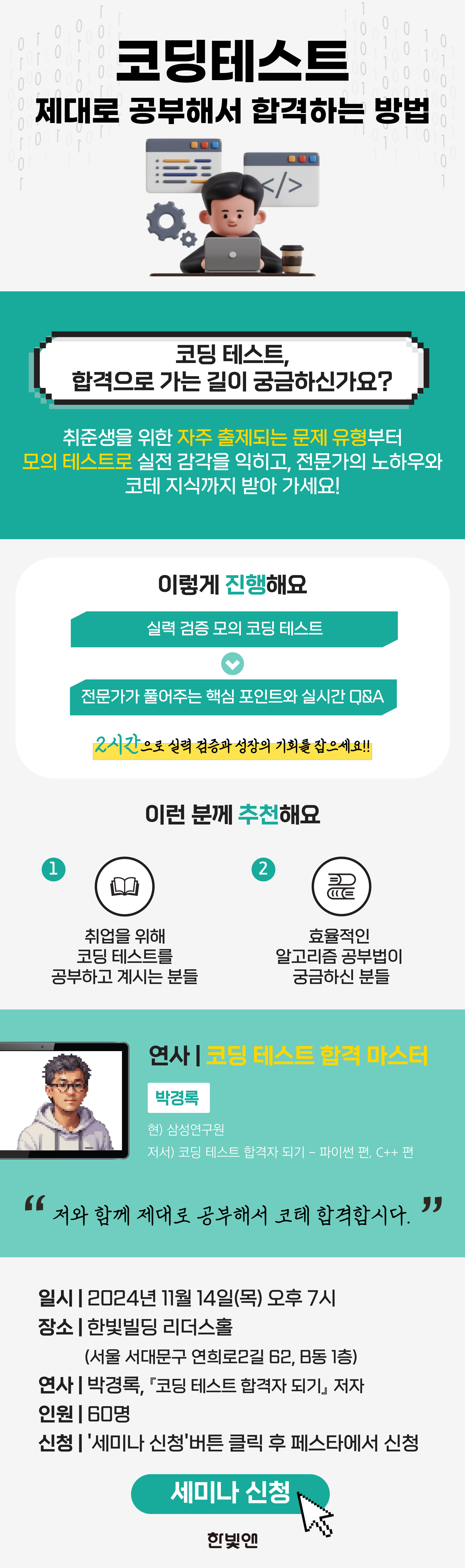 이번 세미나에서는 코딩 테스트를 더 쉽게 이해하고, 자주 나오는 문제 유형도 함께 파헤쳐 봅니다. 알고리즘과 자료구조 선택, 시간 복잡도까지 실전에 딱 맞는 꿀팁들도 배워보실 수 있어요.