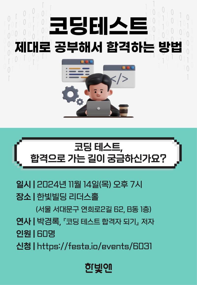 게다가 모의 코딩 테스트를 통해 실전처럼 문제를 풀어보고, 바로바로 전문가 피드백과 노하우도 얻을 수 있는 기회! 코딩 테스트에서 합격을 위한 핵심 전략을 이번에 꼭 만나보세요.