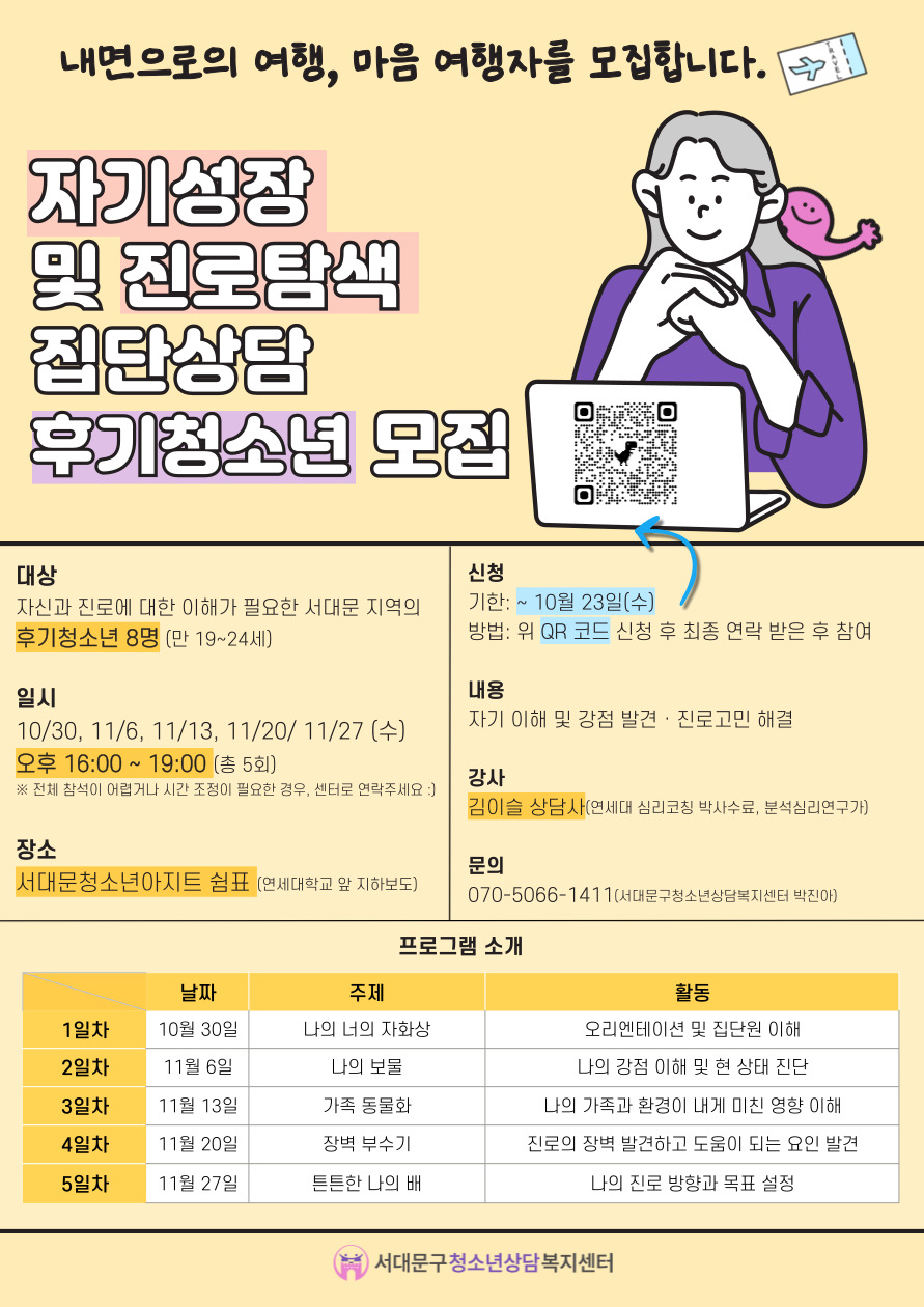 서대문구청소년상담복지센터에서는 2학기를 맞이하여 자기성장 및 진로 집단상담을 계획하고 있습니다.