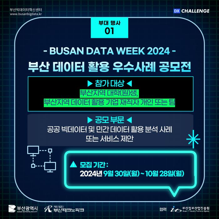 - 공고명 : 「BUSAN DATA WEEK 2024」부산 데이터 활용 우수사례 공모전