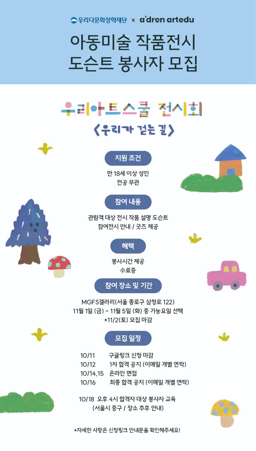 2024 <우리아트스쿨> 의 작품 전시 '우리가 걷는 길'의 도슨트 자원봉사자를 모집합니다.