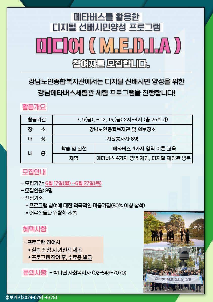 디지털 선배시민을 양성하기 위한 "미디어(M.E.D.I.A)" 사업을 진행합니다.