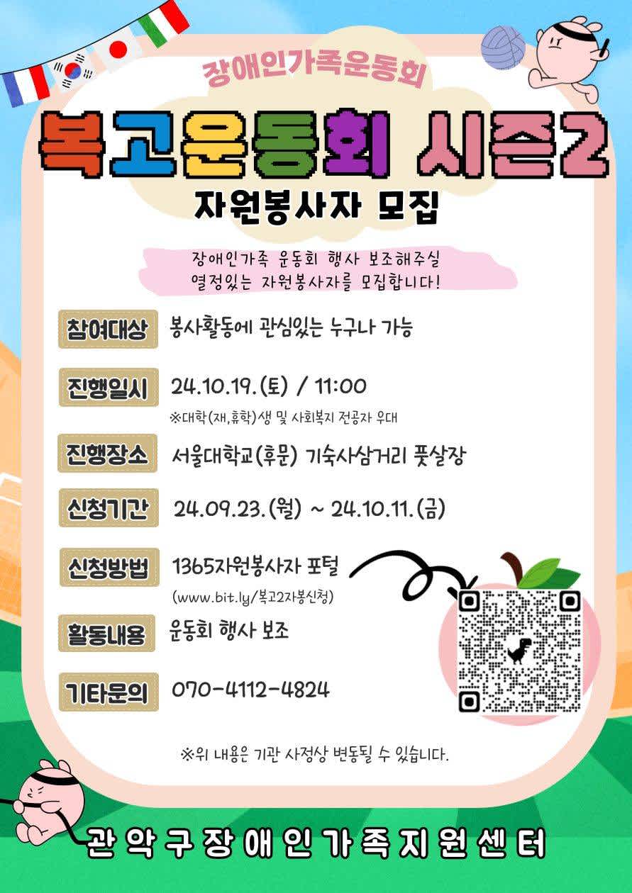 관악구장애인가족지원센터에서는 장애인 가족 운동회 진행에함께 해 주실 자원봉사자를 모집합니다.