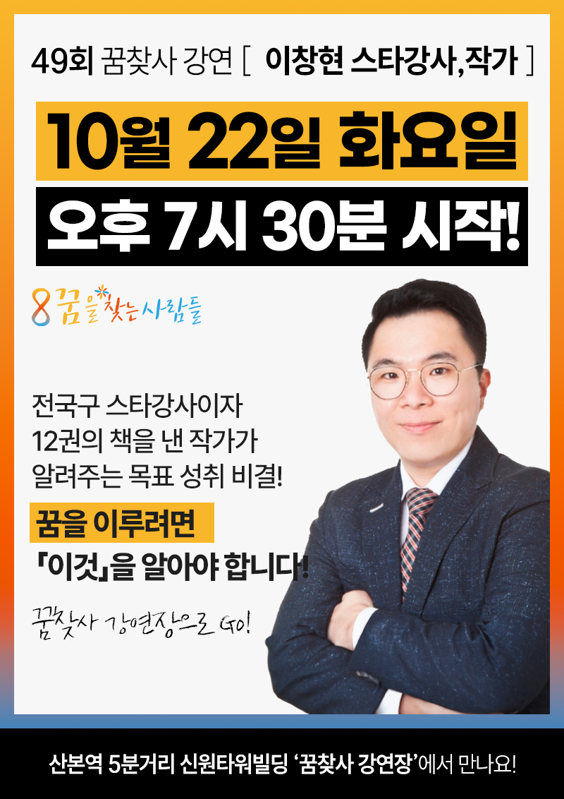 강연은 10월 22일 화요일 오후 7시 30분 꿈찾사 강연장에서 시작합니다!