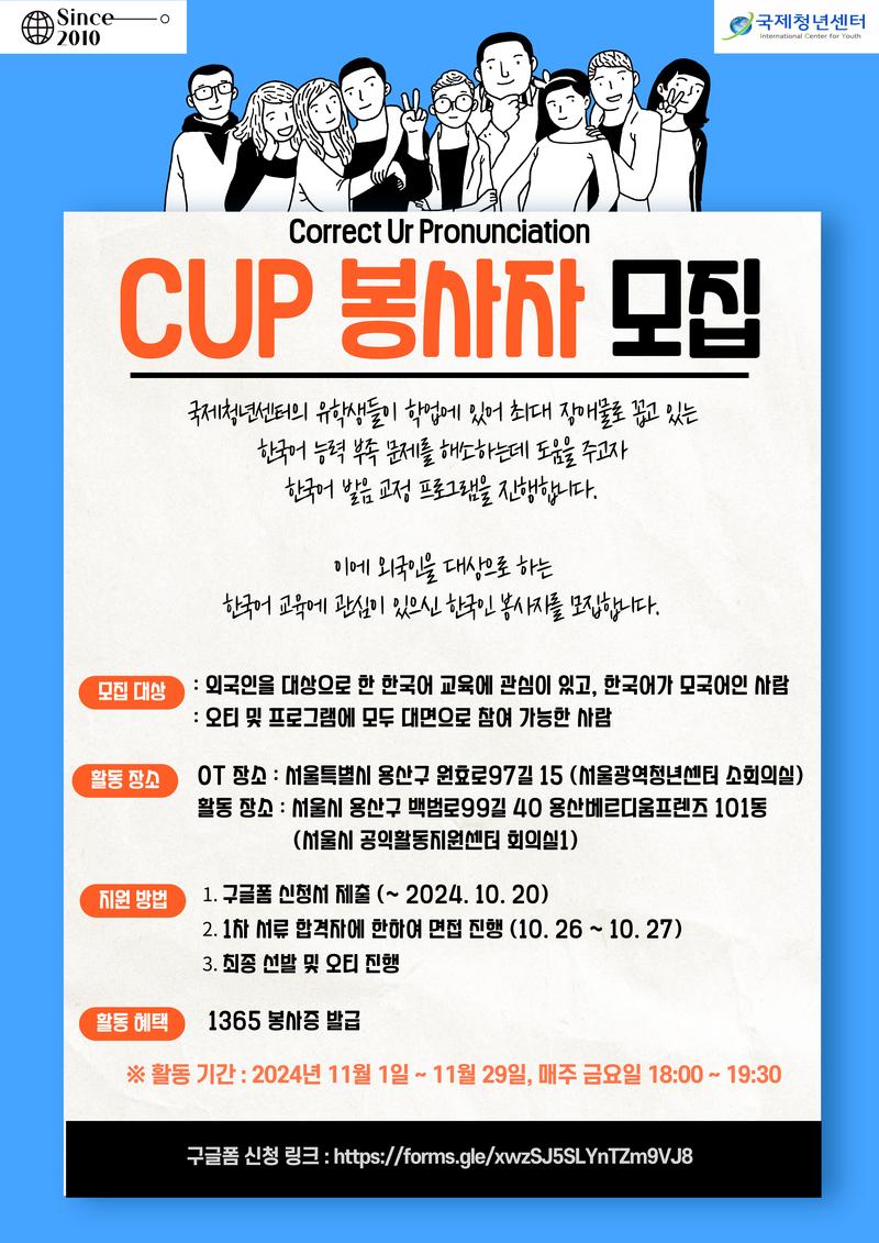 국제청년센터는 유학생의 한국어 교육을 위한 활동을 지속적으로 진행해왔으며, 유학생들의 한국어 능력 향상에 도움을 드리기 위해 최선을 다하고 있습니다. 이를 함께 이끌어나갈 봉사자 분들을 모집하오니 많은 관심과 참여 부탁드립니다!