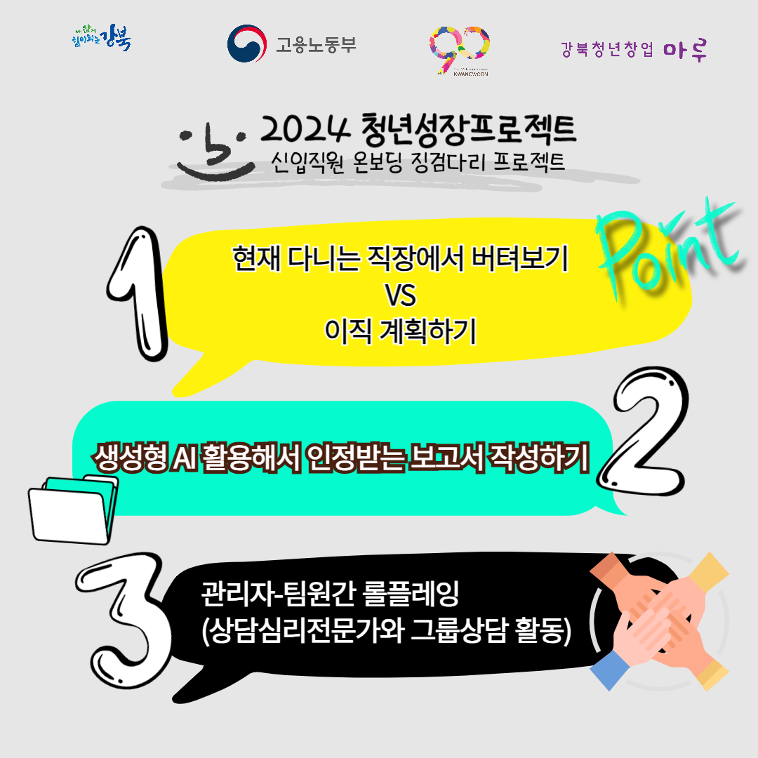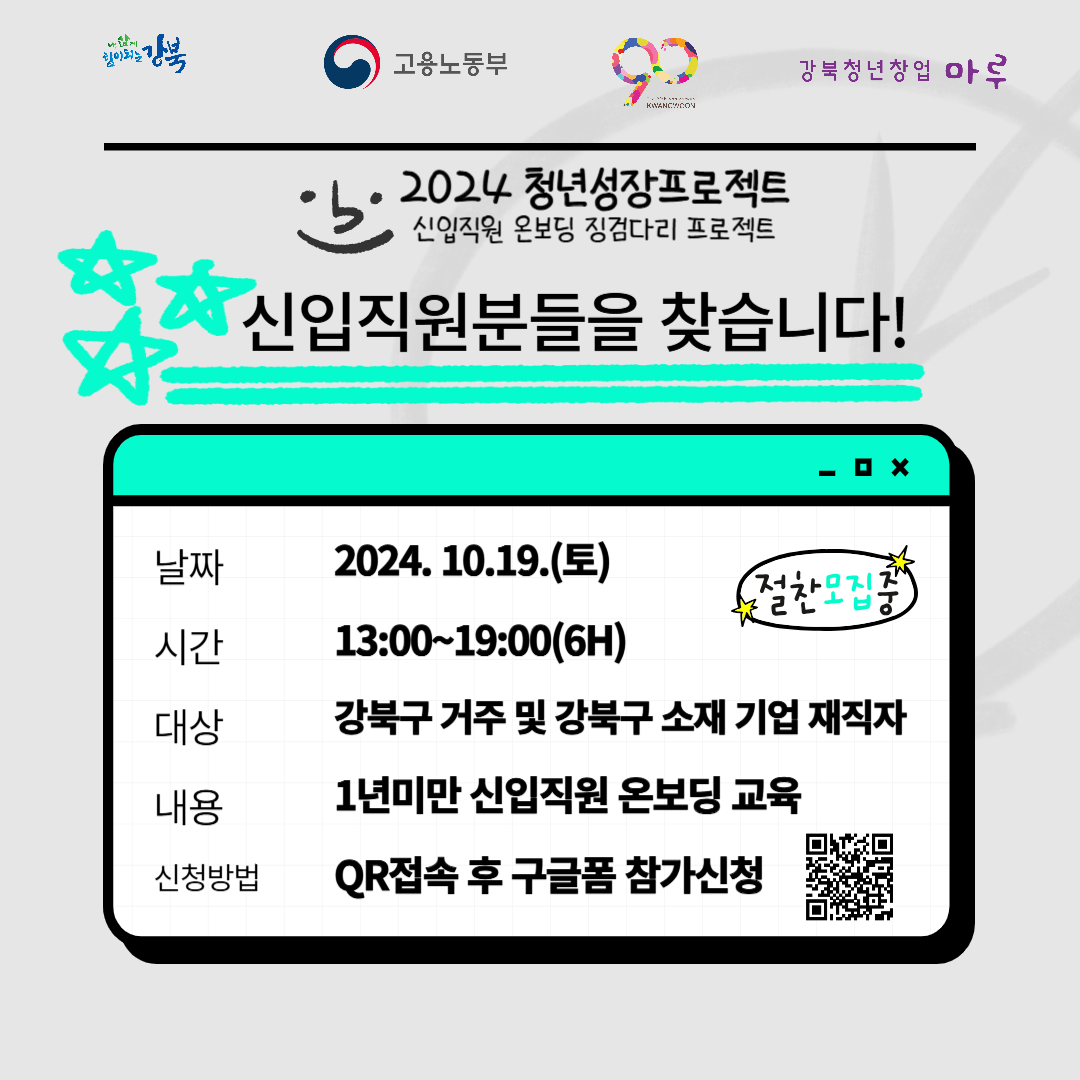 강북창업지원센터에서 진행하는 ‘2024 청년성장프로젝트 - 신입직원 온보딩 징검다리 프로젝트’를 소개해드립니다.