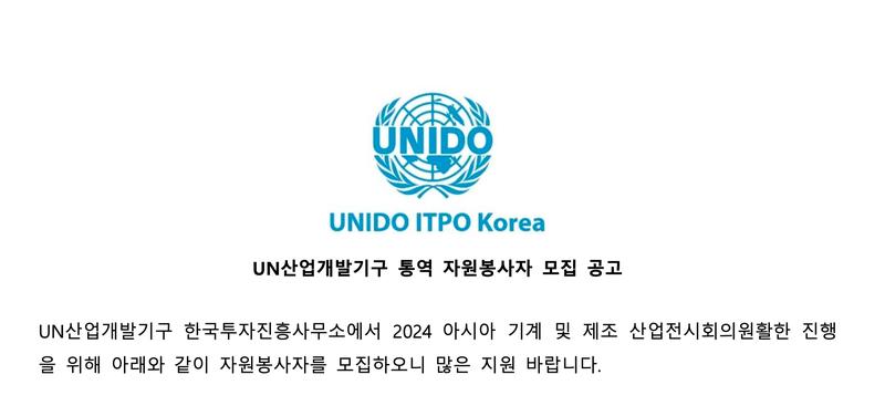 UN산업개발기구 한국투자진흥사무소에서 2024 아시아 기계 및 제조 산업전시회의원활한 진행을 위해 아래와 같이 자원봉사자를 모집하오니 많은 지원 바랍니다.