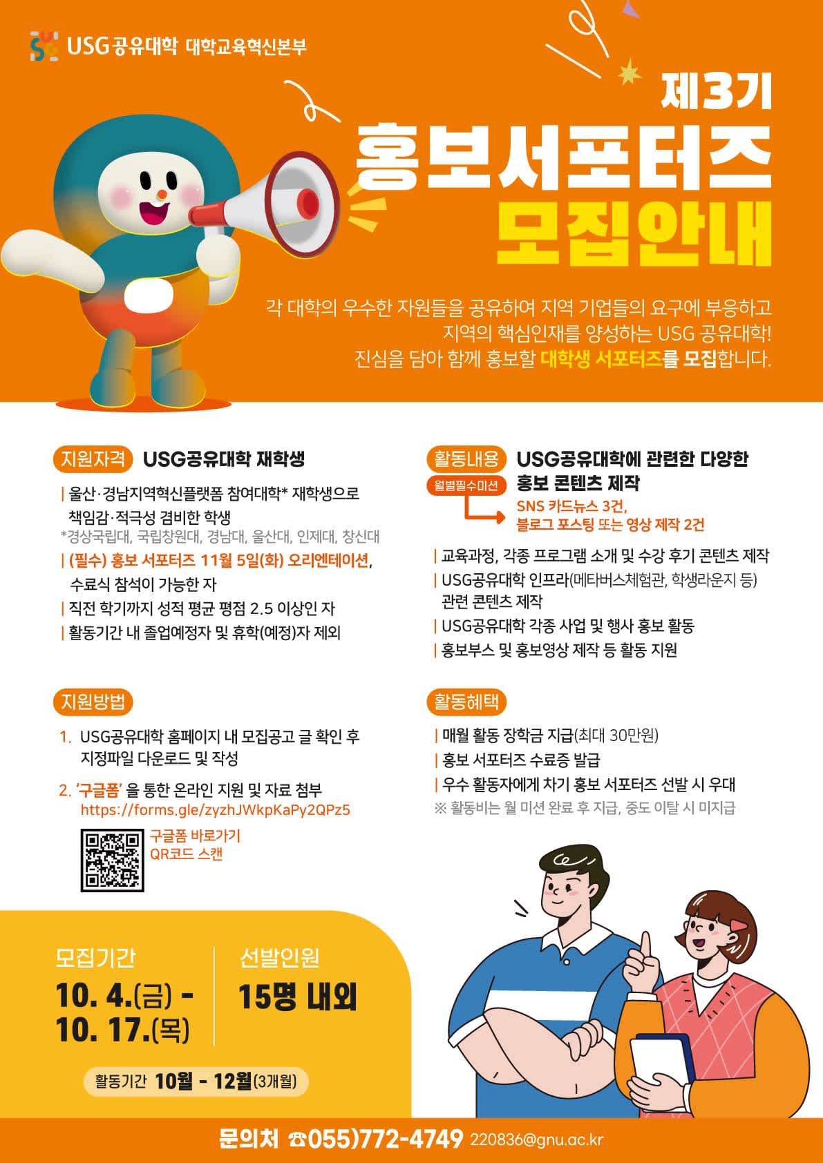 [USG공유대학 대학교육혁신본부] 제3기 홍보 서포터즈 지원 신청(◀링크클릭) 혹은 포스터 QR확인 통해 지원