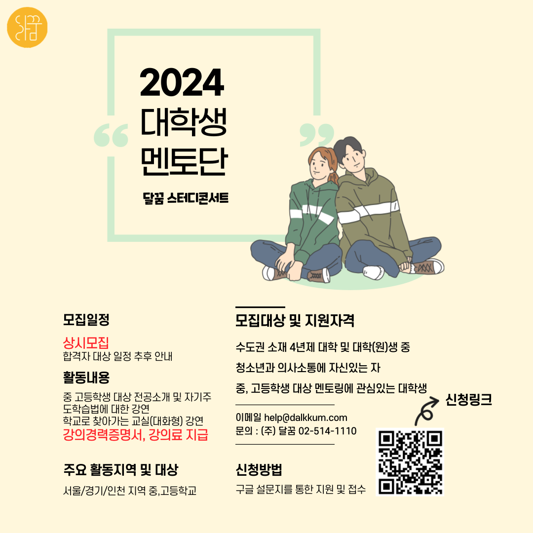 안녕하세요! 대한민국 청소년 멘토링 플랫폼 NO.1 달리는 꿈 ‘달꿈’입니다.
