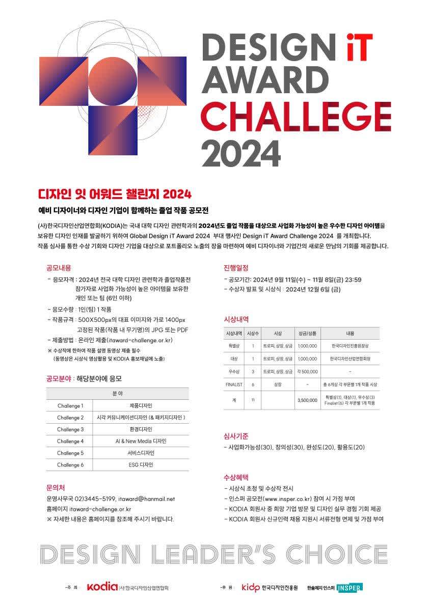 (사)한국디자인산업연합회(KODIA)는 국내 대학 디자인 관련학과의 2024년도 졸업 작품을 대상으로 사업화 가능성이 높은 우수한 디자인 아이템을 보유한 디자인 인재를 발굴하기 위하여 「Global Design iT Award 2024」의 부대 행사인 「디자인 잇 어워드 챌린지 2024」을 개최합니다. 작품 심사와 시상을 통해 수상 기회와 디자인 기업을 대상으로 포트폴리오 노출의 장을 마련하여 예비 디자이너와 기업 간의 새로운 만남의 기회를 제공하고자 하니 많은 관심과 참여 바랍니다.