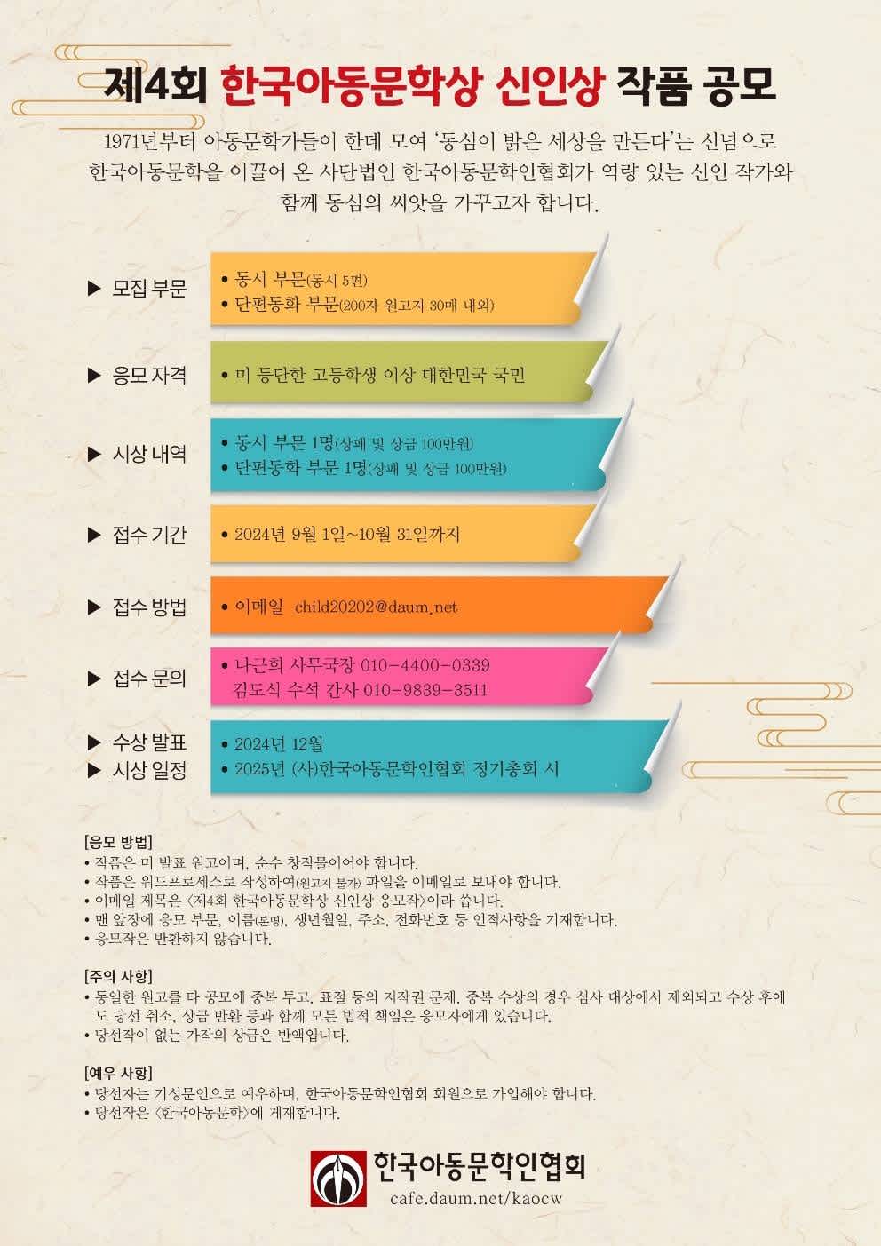 - 당선자는 기성문인으로 예우하며, 한국아동문학협회 회원으로 가입해야 합니다.