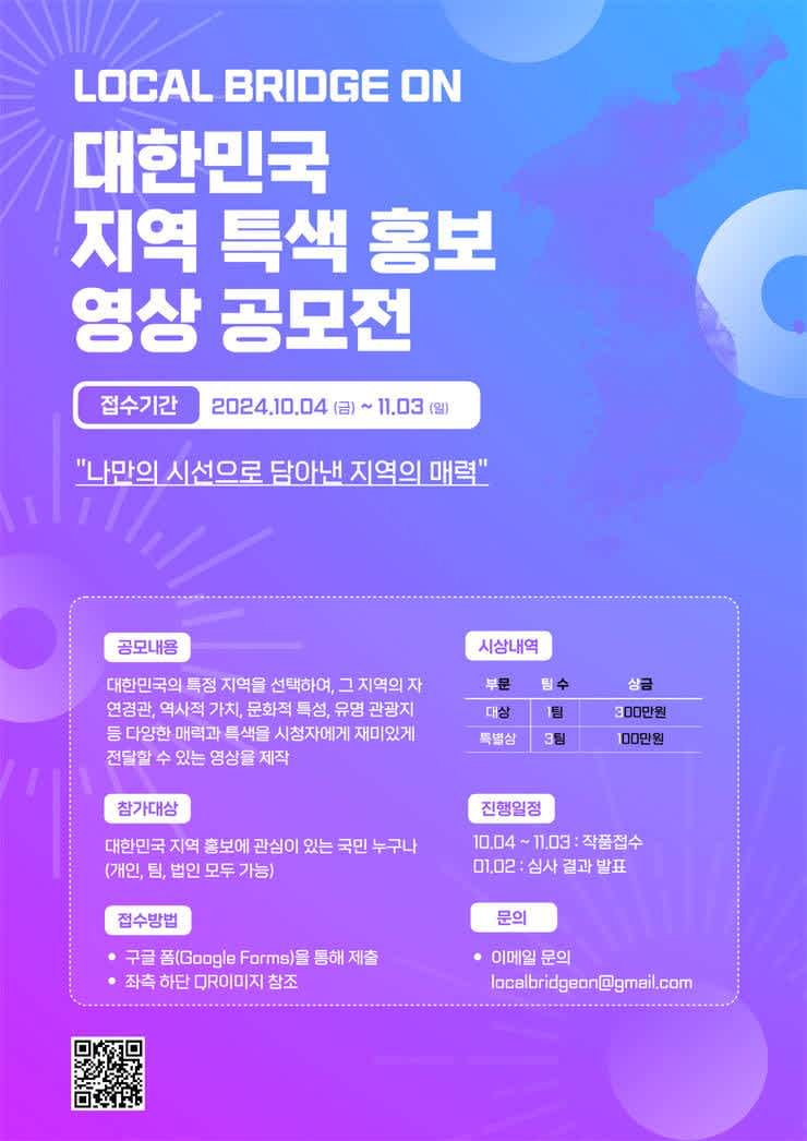 - 특별상: 홍보한 지역(지자체)에 대한 영상 제작 용역 제공 기회(회당 100만원)