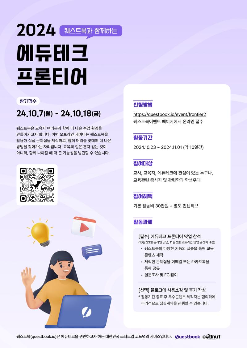 교육의 미래를 준비하는 여러분! 이번 에듀테크 프론티어를 통해 교육 콘텐츠 제작의 새로운 장을 여는 경험을 퀘스트북이 함께합니다.. 지금 바로 신청하세요!