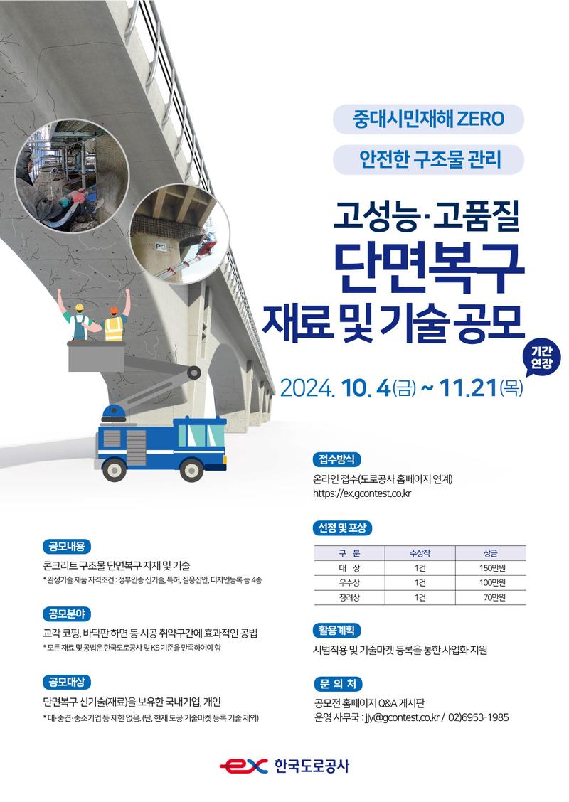 단면복구 신기술(재료)을 보유한 국내기업, 개인* 대·중견·중소기업 등 제한 없음. 단, 현재 도공 기술마켓 등록 기술 제외