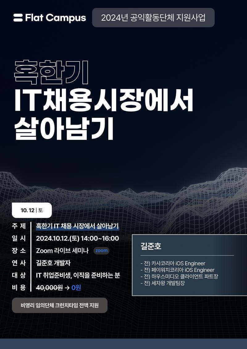 플랫캠퍼스에서 길준호 연사님을 모시고 <혹한기 IT채용시장>에서 살아남을 수 있는 구체적인 방법을 알려드립니다.