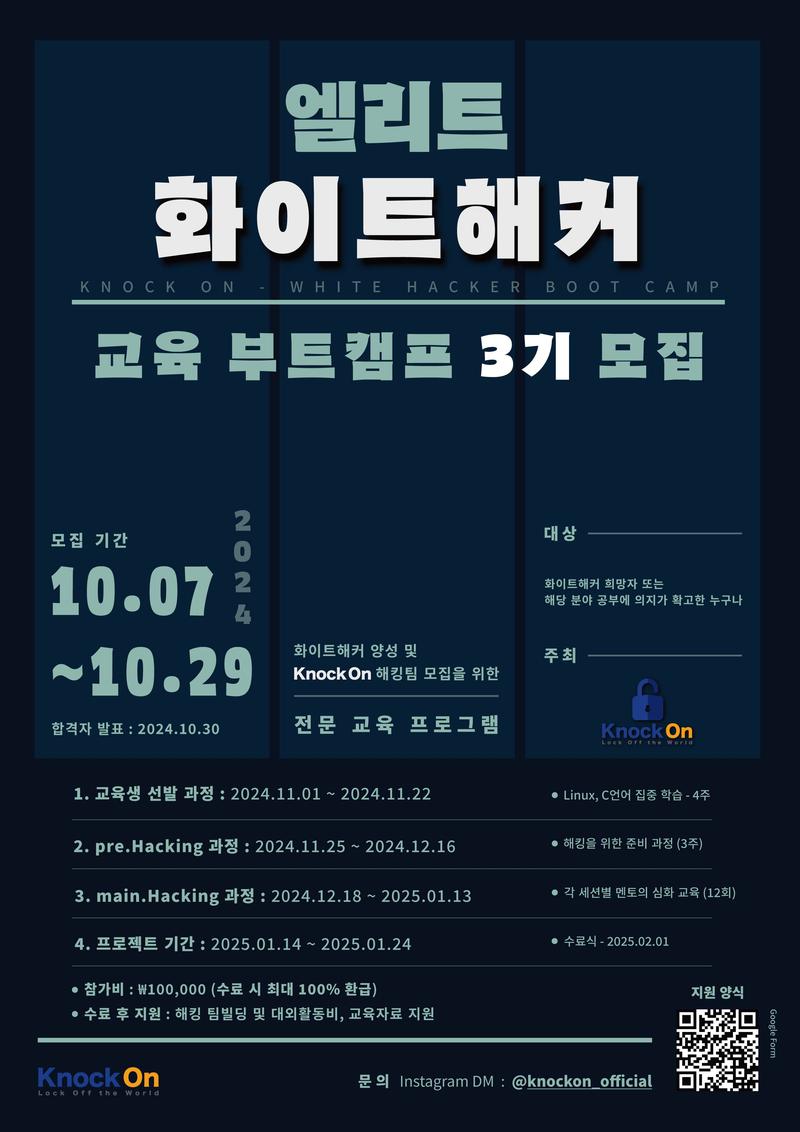 - 수료를 성공적으로 마친 교육생을 대상으로 해킹팀 빌딩과 여러 대외활동에 대한 지원이 제공됩니다! 부트캠프 수료자를 전문적인 해커로 성장시키기 위한 지원을 아끼지 않습니다.