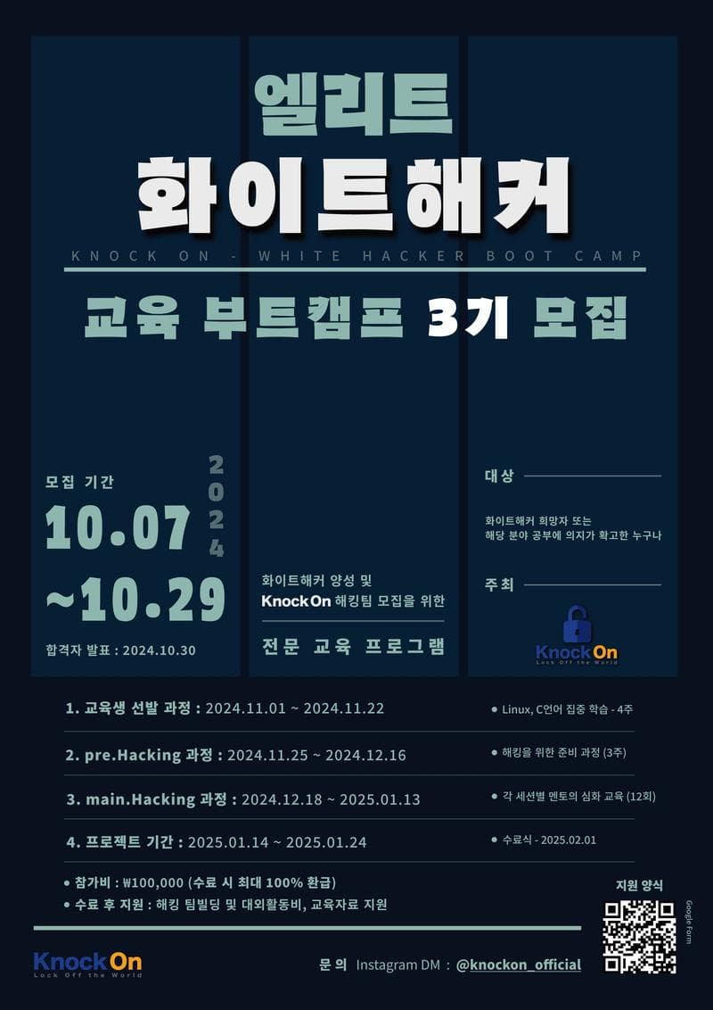 - ๊ต์ก์ ์ ๋ฐ๊ณผ์ ์ดํ ์ ๋ฐ๋ ๊ต์ก์์ ๋์์ผ๋ก ๋ณธ ๊ต์ก๊ณผ์ ์ ์งํํฉ๋๋ค. ๊ต์ก์ ์ ๋ฐ๊ณผ์ ์์๋ ํดํน์ ํ์ํ ๊ธฐ์ด ์ง์์ธ Linux, C์ ๊ฐ๋ฐ์ ๋ํ ์ง์์ ์ค์ ์ ์ผ๋ก ๋ฐฐ์ฐ๊ณ ๋ณธ ๊ต์ก๊ณผ์ ์์ ๋ณธ๊ฒฉ์ ์ผ๋ก ํดํน์ ๋ํด์ ๋ฐฐ์ฐ๊ฒ ๋ฉ๋๋ค.