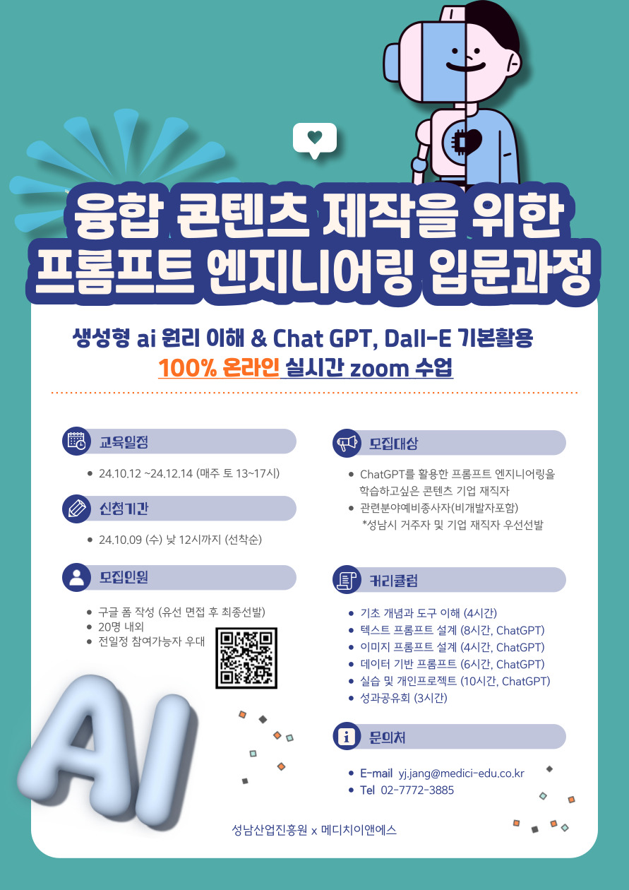 과정소개 : 프롬프트 기반 생성형 AI인 ChatGPT와 Dall-E를 중심으로 기획 의도에 맞춘 콘텐츠를 제작하는 실습형 프롬프트 엔지니어링 과정입니다. 성남시 거주자 및 재직자를 우선선발하여 100% 온라인 비대면으로 교육이 진행됩니다.