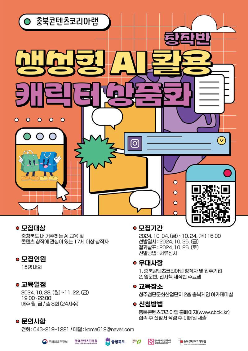 충북콘텐츠코리아랩에서 진행하는 ‘생성형 AI를 활용한 콘텐츠 창작과정’의 캐릭터 상품화반 교육생을 모집합니다.