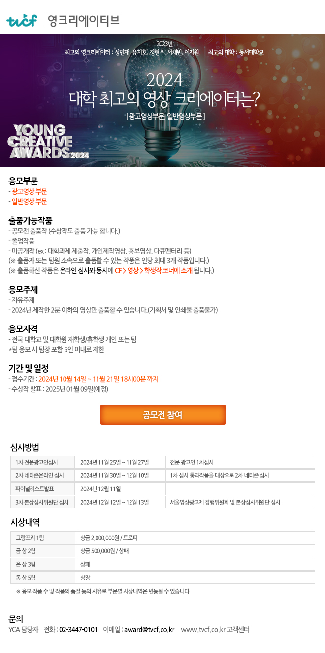 - 온라인 출품: https://www1.tvcf.co.kr/TvcfAward/Yca/YCA_intro.asp