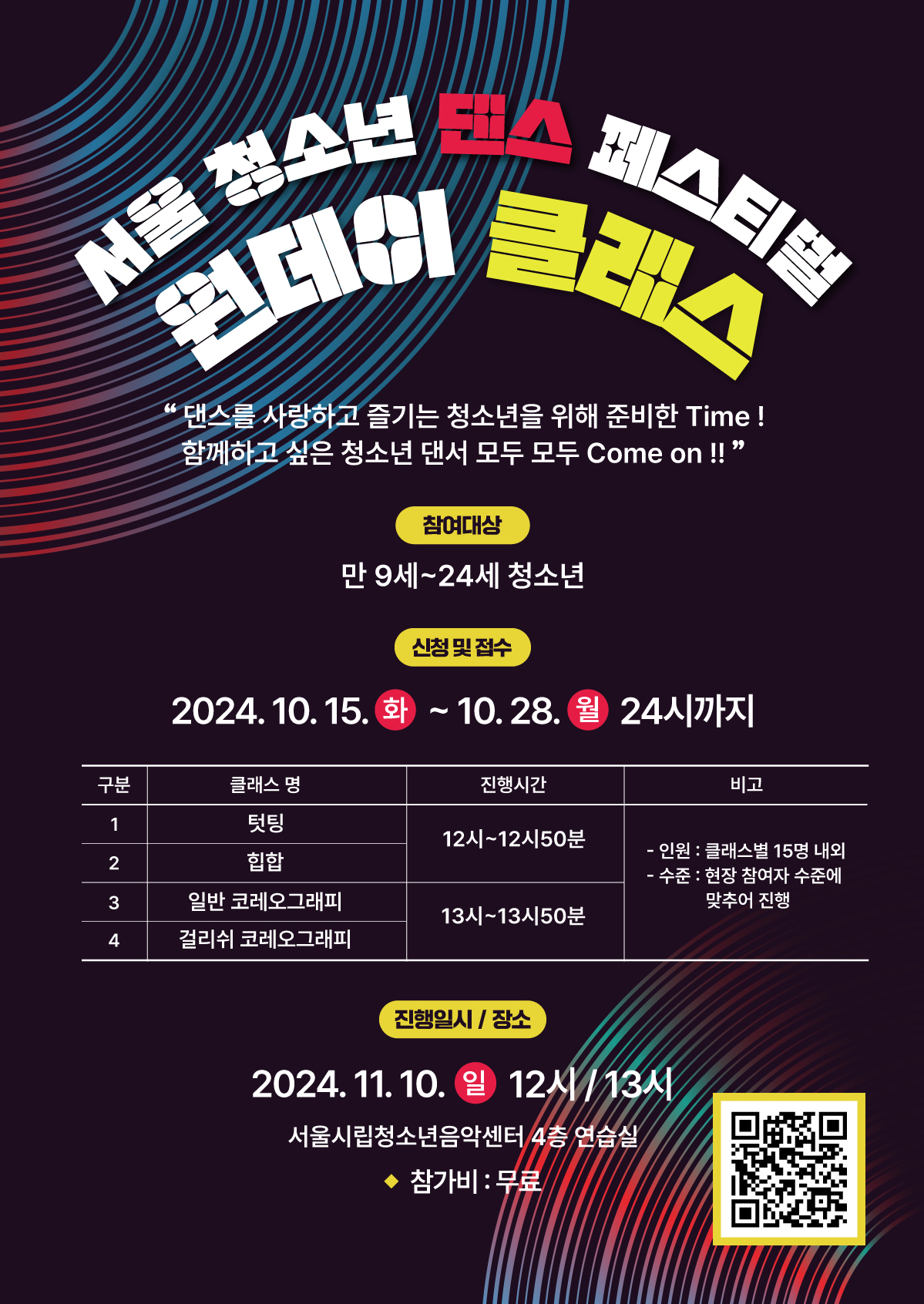 시립청소년음악센터에서 댄스페스티벌이 열립니다! 댄스를 사랑하는 여러분을 위해 다양한 #원데이클래스 를 개설하였습니다. 많은 신청 바랍니다!