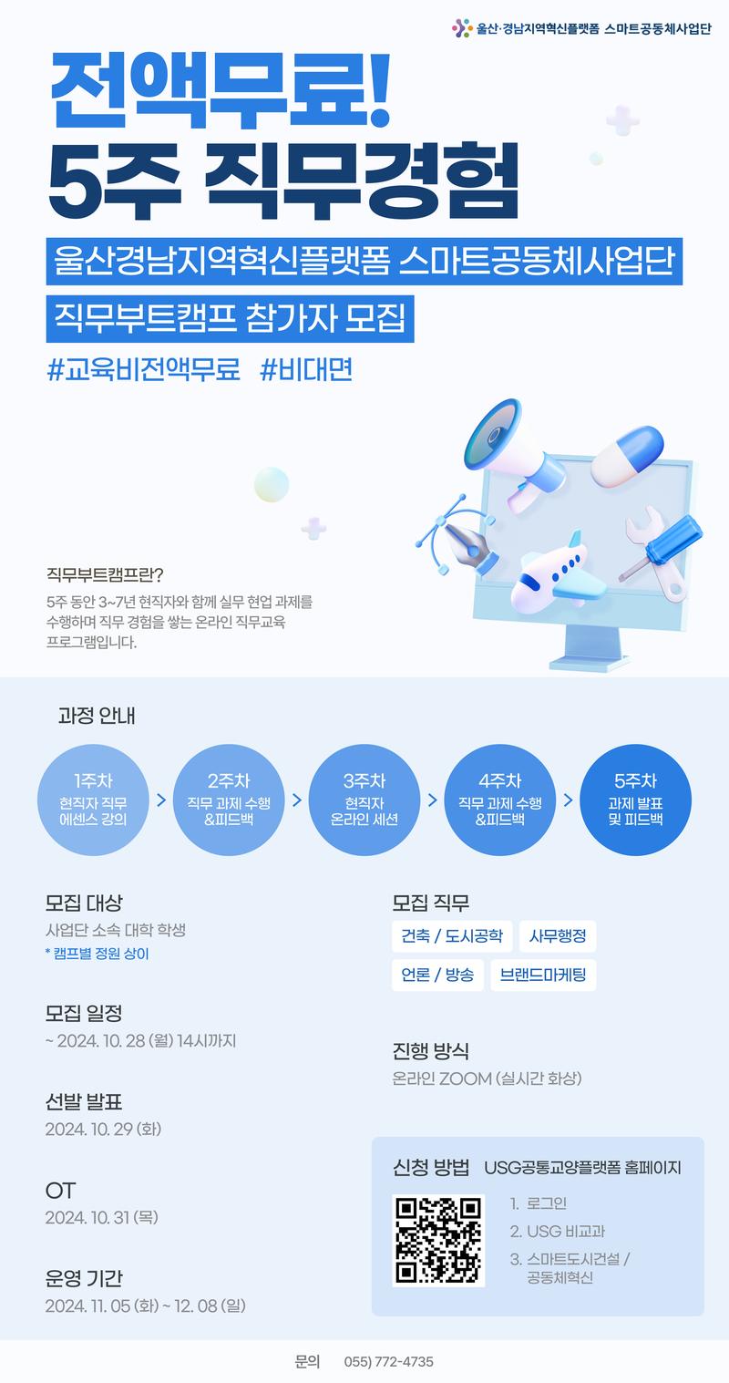 - 5주간 각 분야 현직자와 함께 실무과제를 수행하며 직무를 경험하고 취업역량을 함양하는 온라인 직무교육 프로그램입니다.